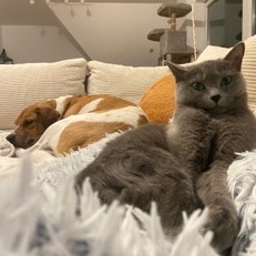 Hallo Jenni, Kanela (jetzt Vulpi) hat sich super schnell bei uns eingelebt. Sie ist sehr neugierig, liebt ihre Spaziergänge und schläft viel. Natürlich war der Start nicht ganz ohne Herausforderungen, da sie die Katzen sofort anbellte und jagen wollte. Auch wenn sie sie mittlerweile nicht mehr anbellt, reagiert sie dennoch ab und zu impulsiv. Wir üben fleißig und haben eine Hundetrainerin zur Unterstützung. Außerdem haben wir nächste Woche einen Tierarzttermin, um sie durchchecken zu lassen, nochmal gründlicher den aktuellen Juckreiz abzuklären und auch über ihr Gewicht zu sprechen. Trotz dieser Sachen fühlt sie sich hier sehr wohl, begegnet anderen Hunden freundlich, und wir hoffen, dass sich auch die Situation mit den Katzen weiter entspannt, damit sich alle Zuhause wohlfühlen :) Fotos schicken wir gerne zu: