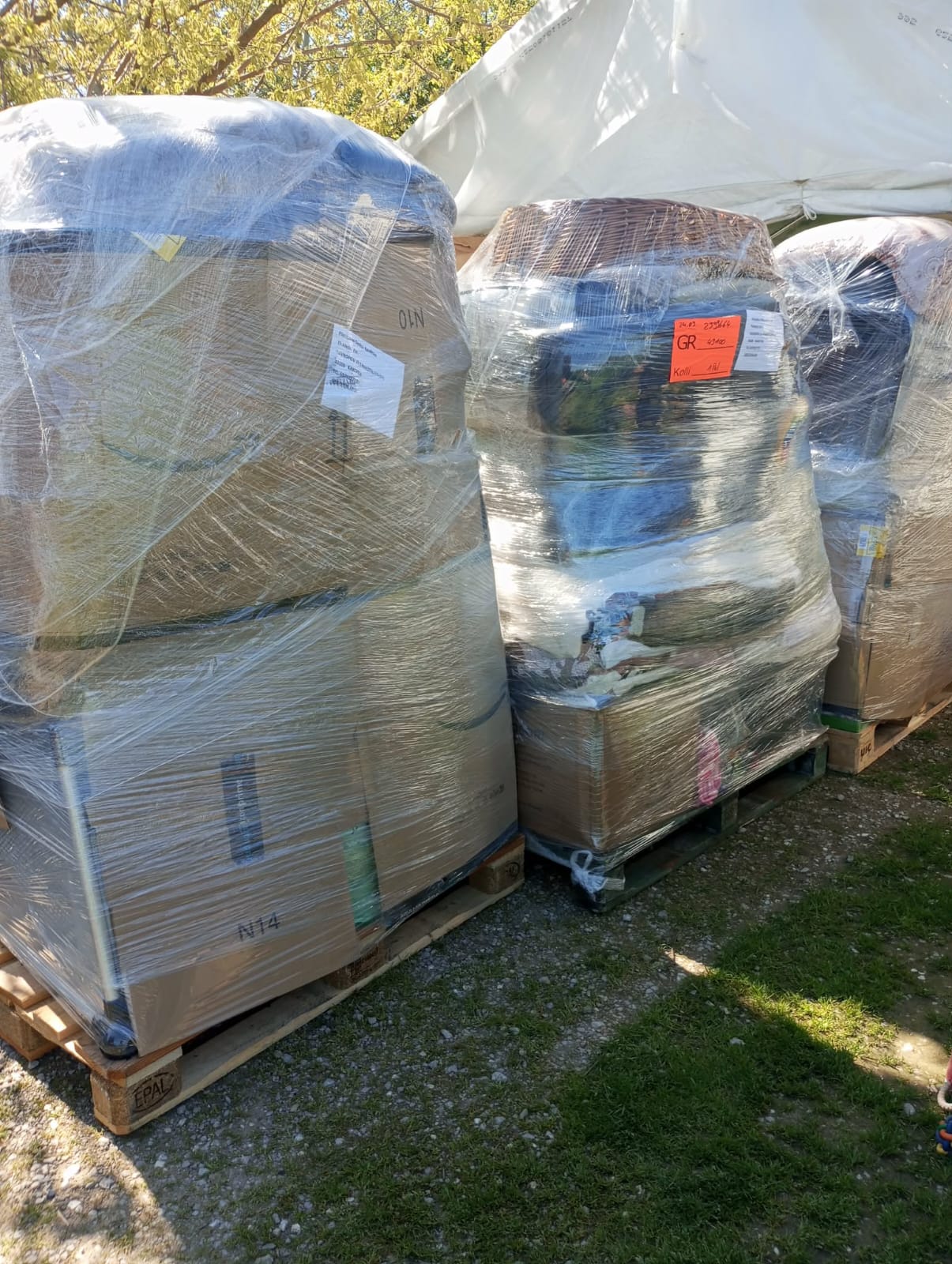 3 pallets came before fwe days full of good things,food,bedhouse,cans,toys,blakents and so so many other things.
