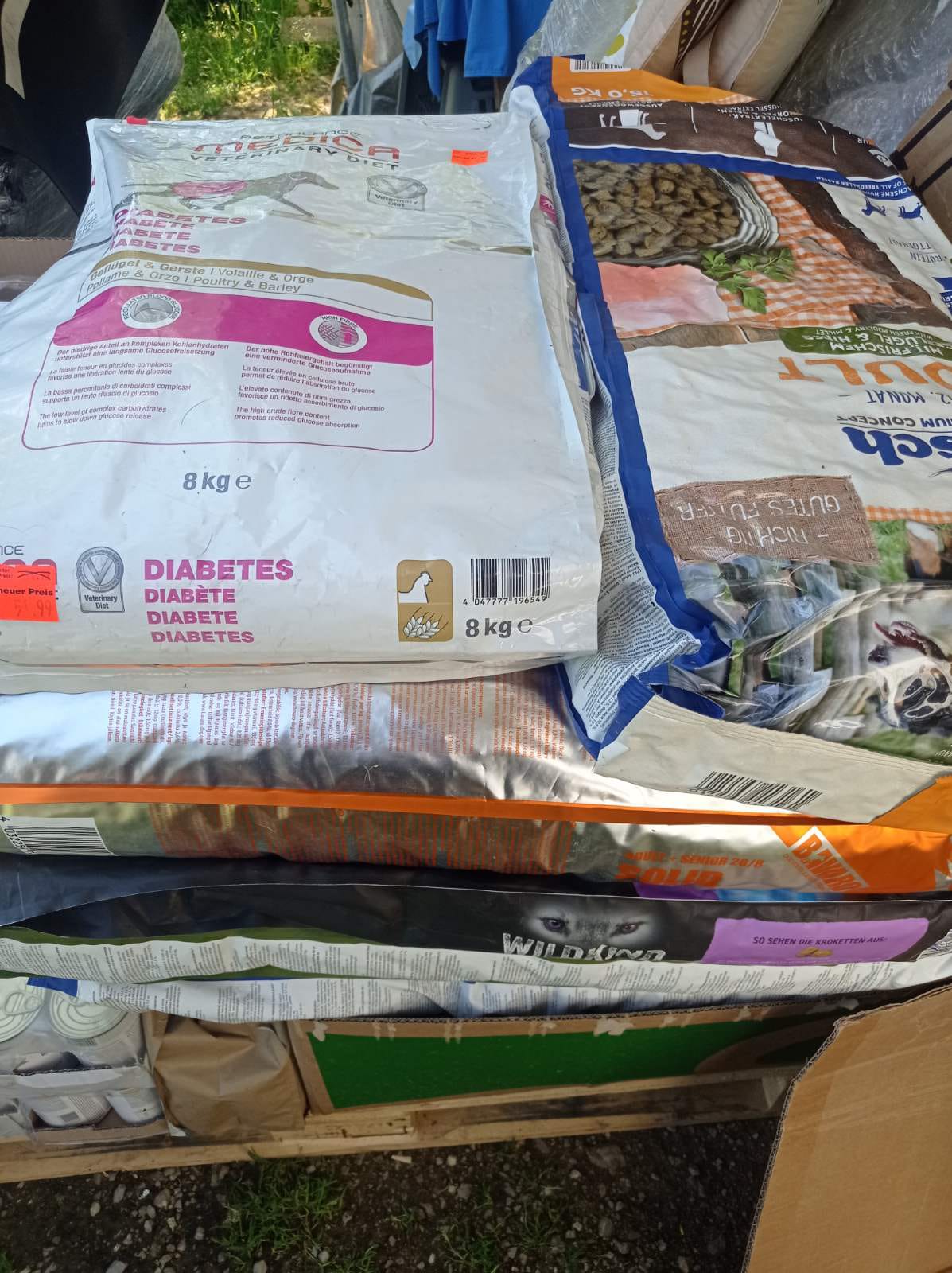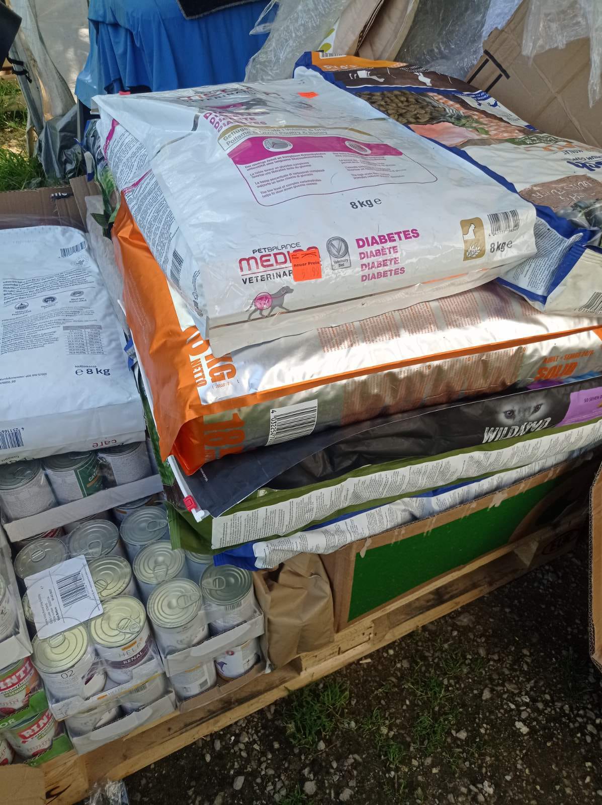 Vor ein paar Tagen, gegen 16 Uhr, erhielt ich zwei weitere Paletten voller wertvoller und nützlicher Dinge, insbesondere dem notwendigen Futter für die Streuner, Hunde und Katzen.