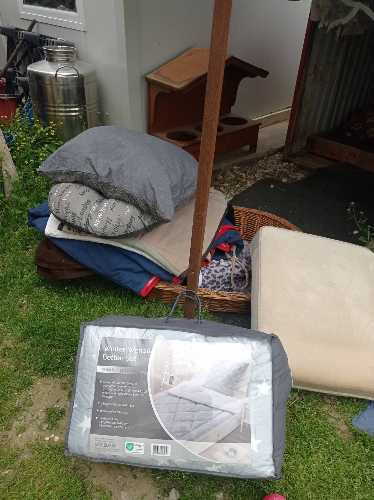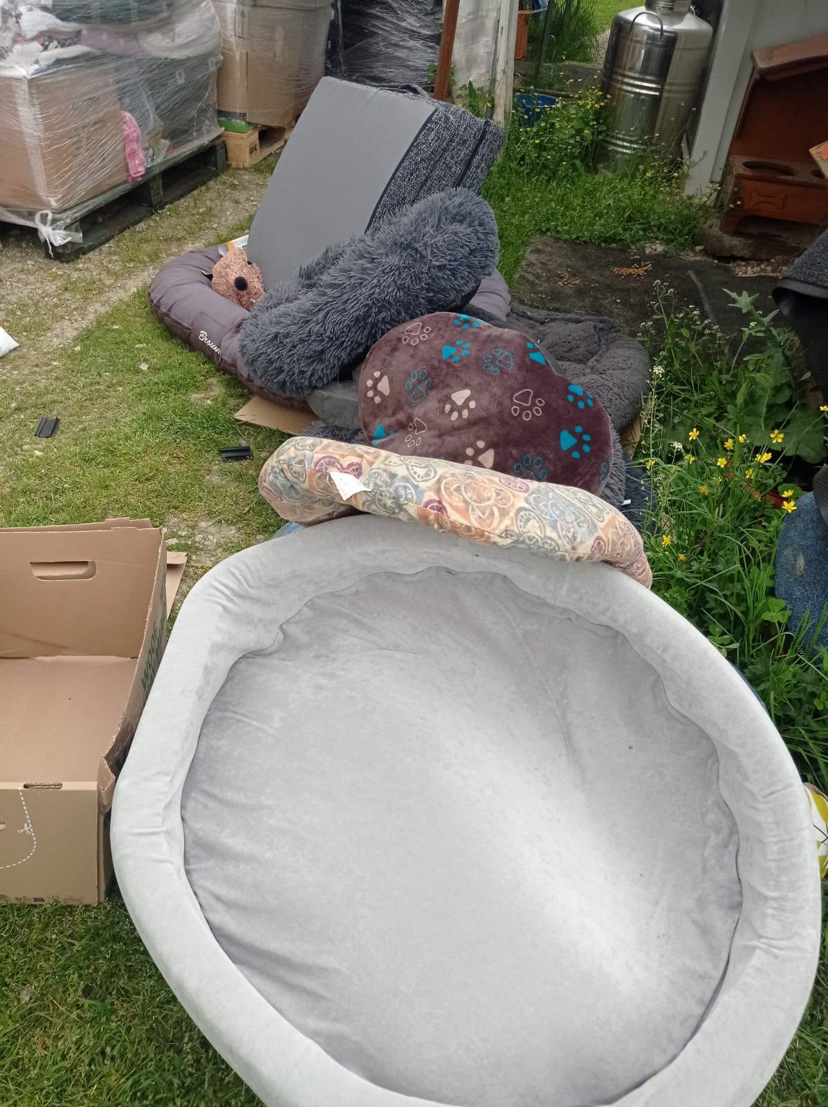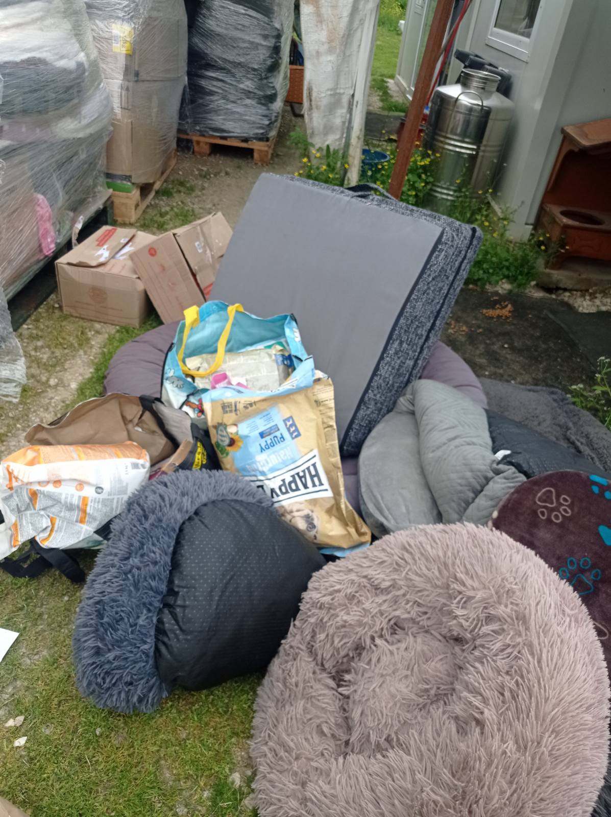 5 Paletten kamen an - voll mit Decken, Handtüchern, Spielzeug, Hundebetten und -hütten