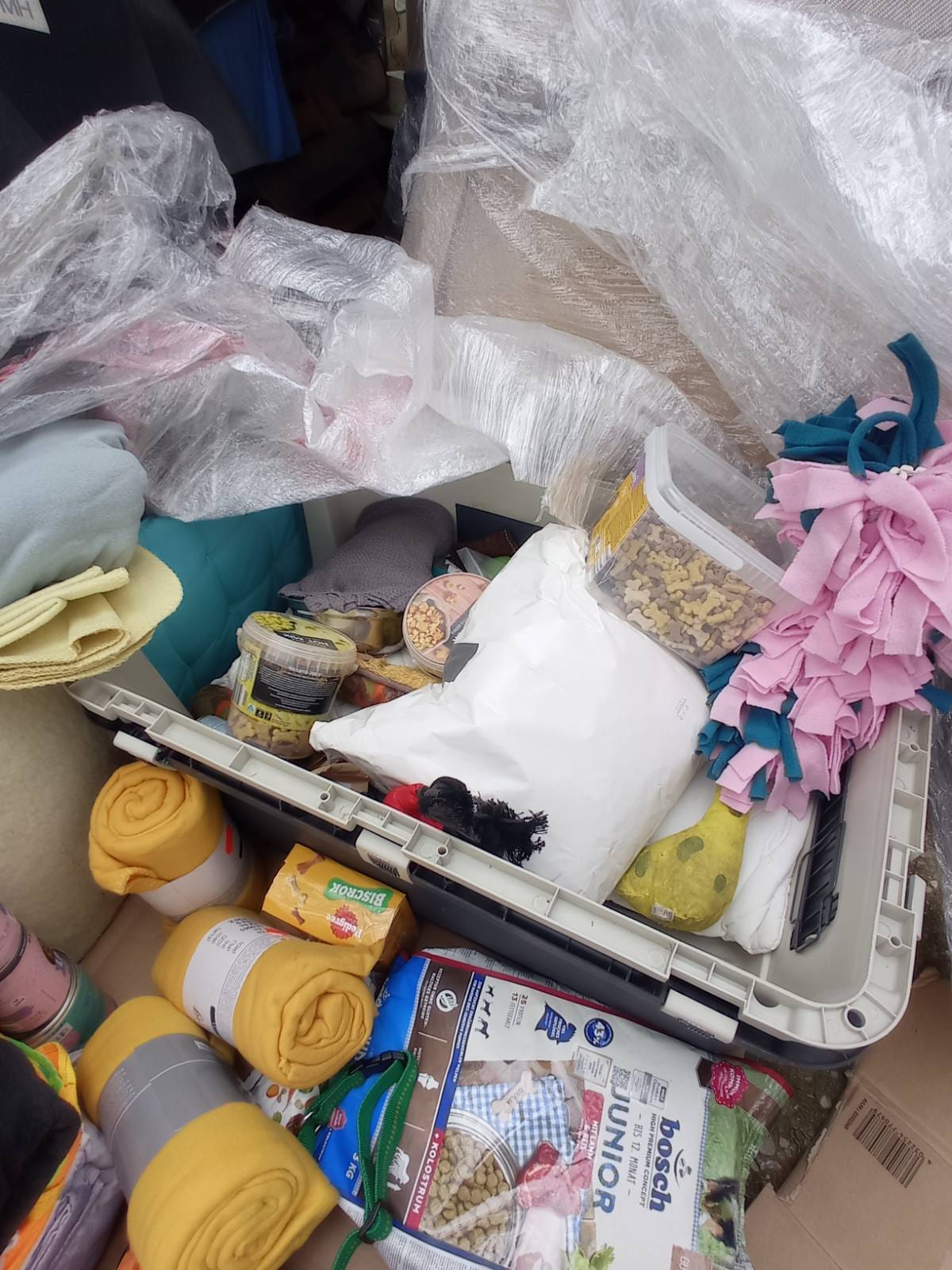 wir erhielten wieder 2 Paletten mit Laken, Spielzeugen, Handtüchern, Hundebetten, Futter und unfassbar viele nützliche Dinge für unsere Tiere.
