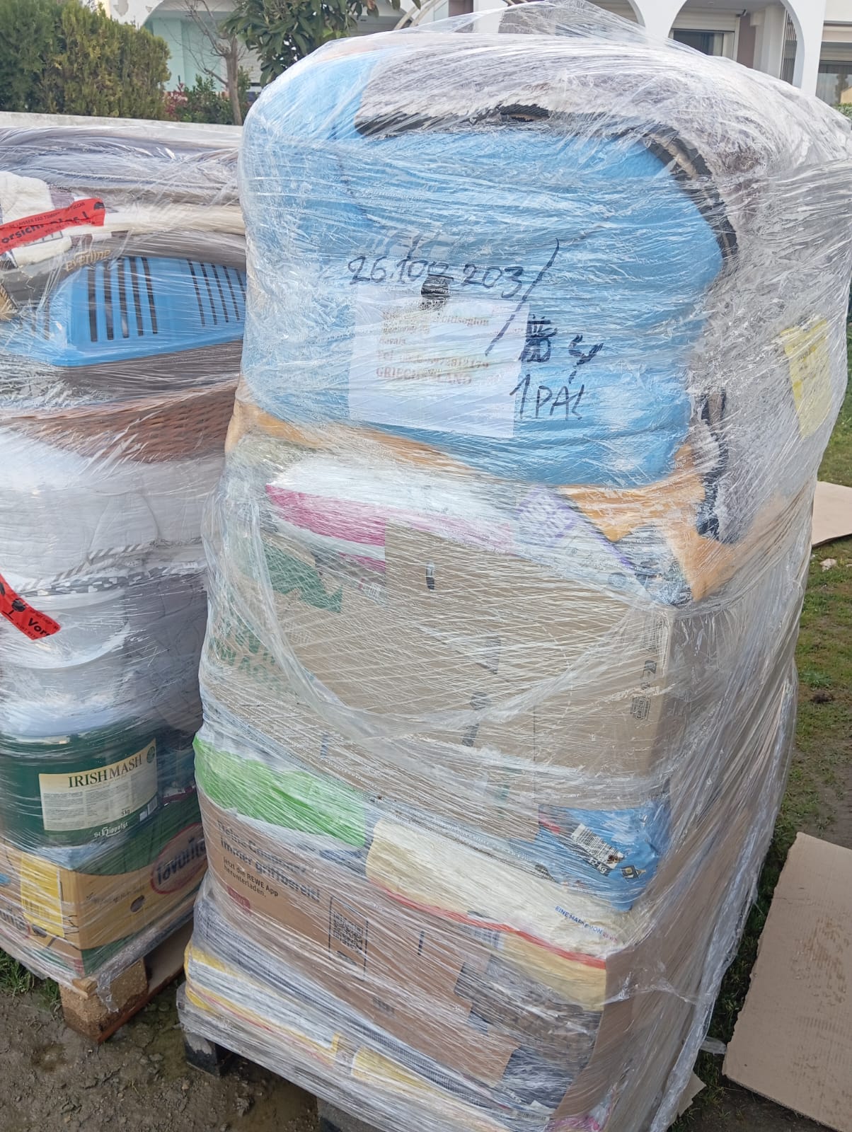 5 Paletten sind angekommen, voll mit Decken, Handtüchern, Hundebetten, Teppichen, Futter, Spielzeug für unsere neuen Welpen und Nassfutter für Hunde. Das ist in dieser Jahreszeit das Beste, da wir in den letzten Wochen sehr viel Regen hatten.