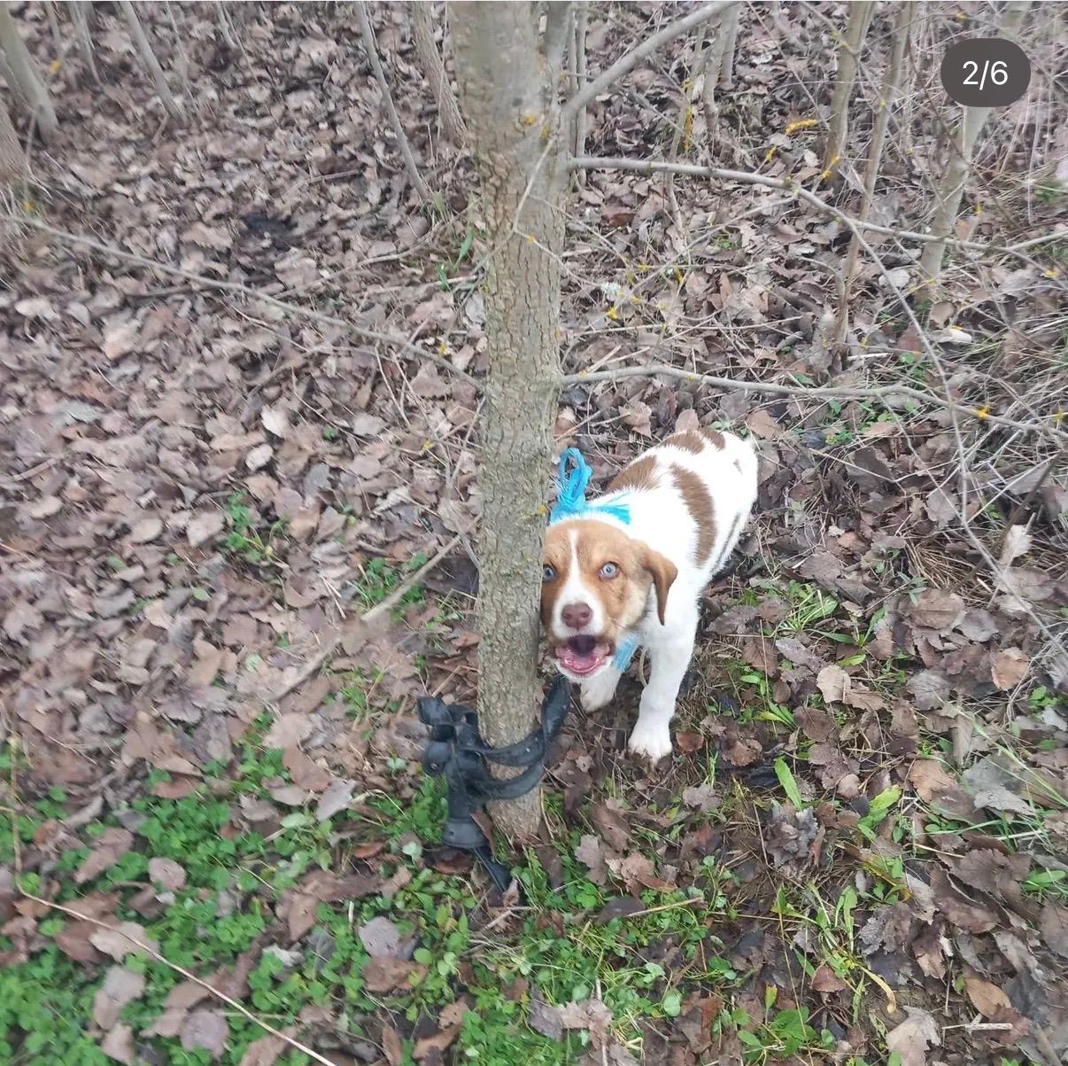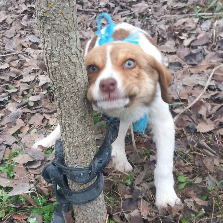 Innerhalb weniger Minuten war Evi vor Ort. Je näher sie den Schreien kam, desto größer wurde das Entsetzen: Das etwa drei Monate alte Hundemädchen war mit einem Männergürtel direkt an einem Baumstamm fixiert, zusätzlich war ihr Hals mit einem Seil angebunden, sodass sie sich nur wenige Zentimeter bewegen konnte. Doch damit nicht genug: Die rechte Vorderpfote und der linke Hinterlauf waren ebenfalls mit einem Strick zusammengebunden. Die kleine Maus war vollständig bewegungsunfähig. Ausgeliefert. Wehrlos.