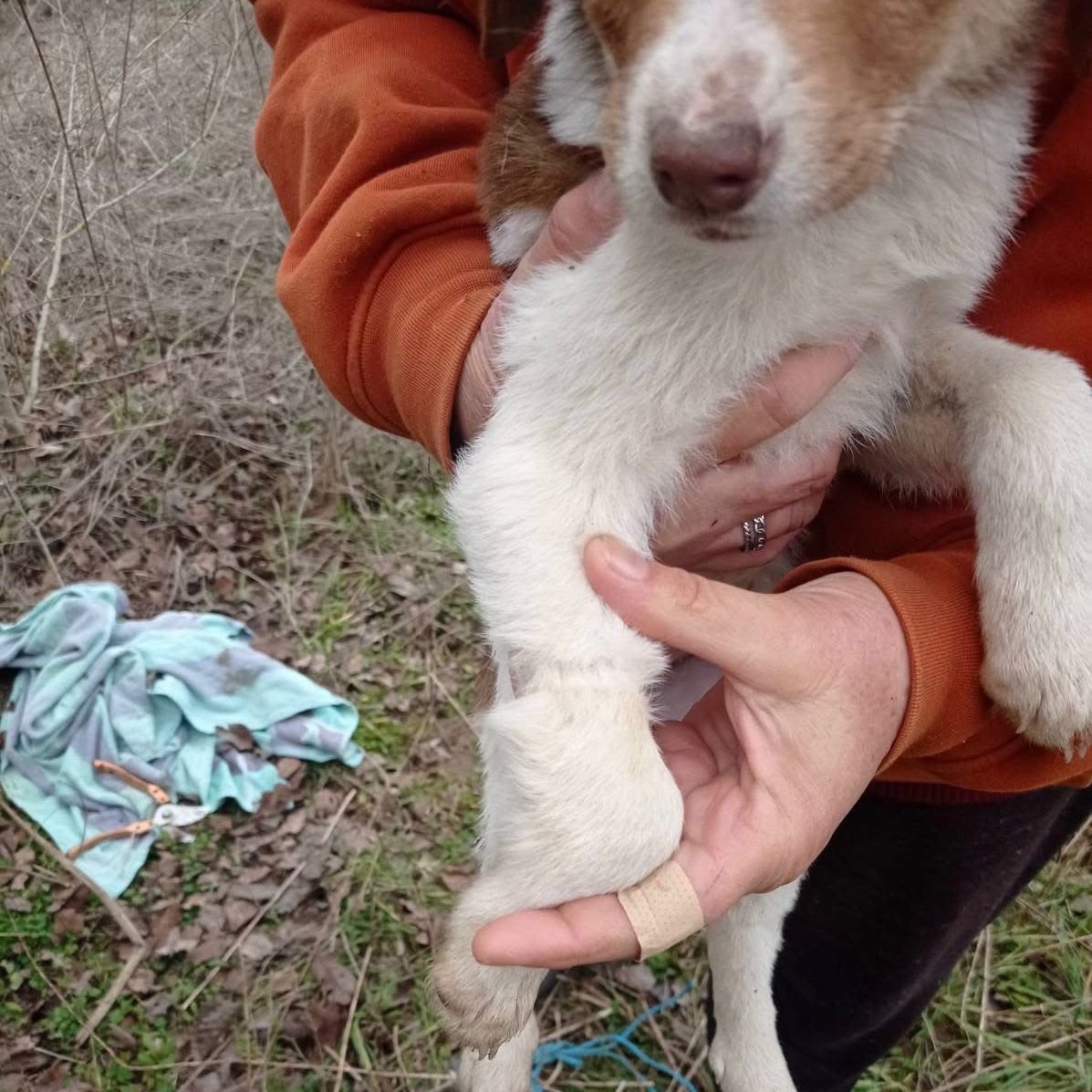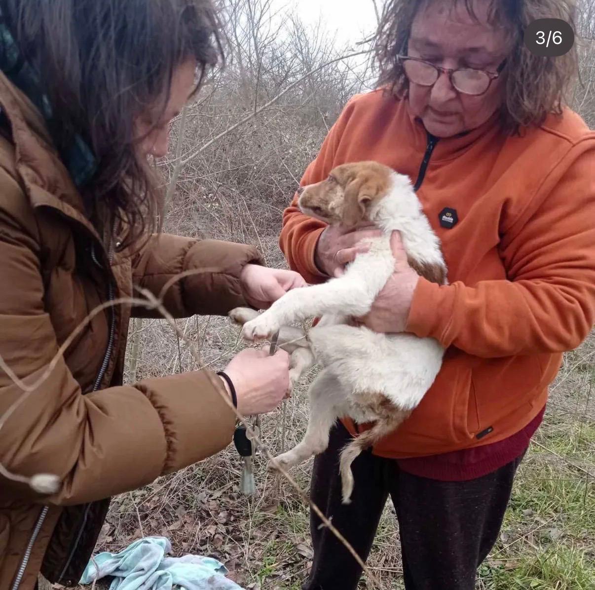 Am Morgen erhielt unsere Tierschützerin Evi Thanou einen Anruf von einer Spaziergängerin. Sie hatte auf einem Feld einen Hund verzweifelt heulen gehört, konnte das Geräusch zunächst aber nicht lokalisieren, da die Umgebung von Ästen und Gestrüpp durchzogen war. Schließlich fand sie einen angebundenen Welpen, völlig hilflos, und bat sofort um Hilfe, da sie nichts bei sich hatte, um ihn zu befreien.