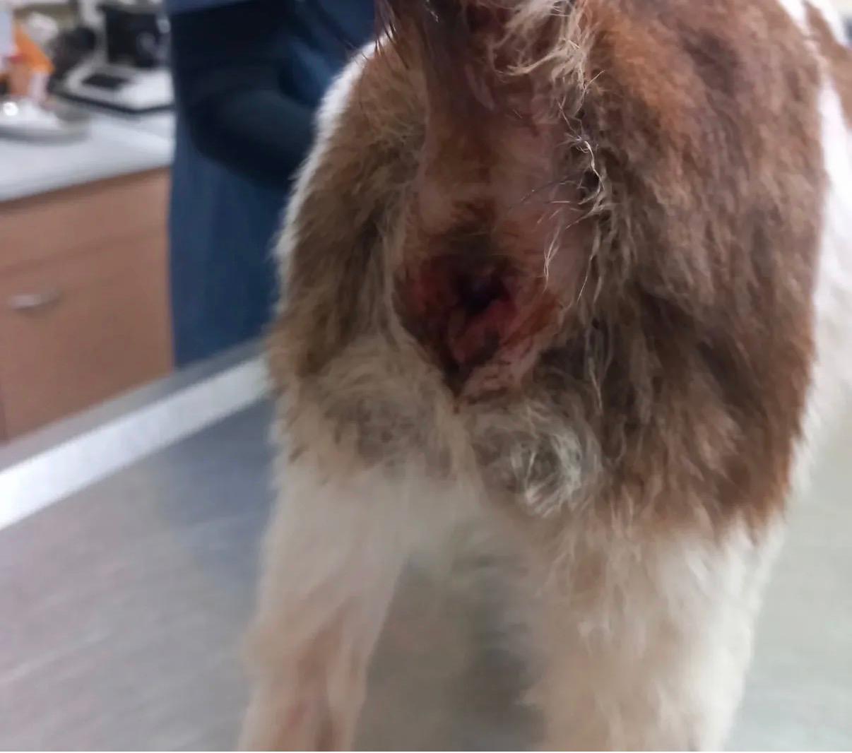Ein anderer junger Mann wurde zum rettenden Schutzengel: Er bemerkte das Geschehen, stoppte den Fahrer und rief die Polizei. Der Tierquäler wurde sofort festgenommen. Die Polizei kontaktierte uns, und wir holten den schwer verletzten Hund umgehend ab. Erste Hilfe erfolgte direkt vor Ort – Schmerzmittel, antiseptisches Spray auf die offenen Wunden. Am nächsten Morgen brachten wir ihn in die Tierklinik. Die Diagnose war niederschmetternd: Zahlreiche tief offene Verletzungen, die bereits begannen, sich zu entzünden und zu verfaulen: