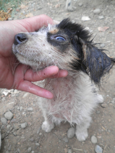 Wenige Stunden später dann das nächste einsame Wesen, vor einer alten Scheune. Ein Welpenmädchen, ebenfalls verletzt! Scheu, aber vertrauensvoll begab auch sie sich in Evis Hände. Keine Chance dort alleine, mit bereits infizierter Pfote. Evi ist dort allein auf weiter Flur, es gibt niemanden! der helfen würde. Also wurde Tania ebenfalls eingepackt, was hätte sie auch tun sollen?