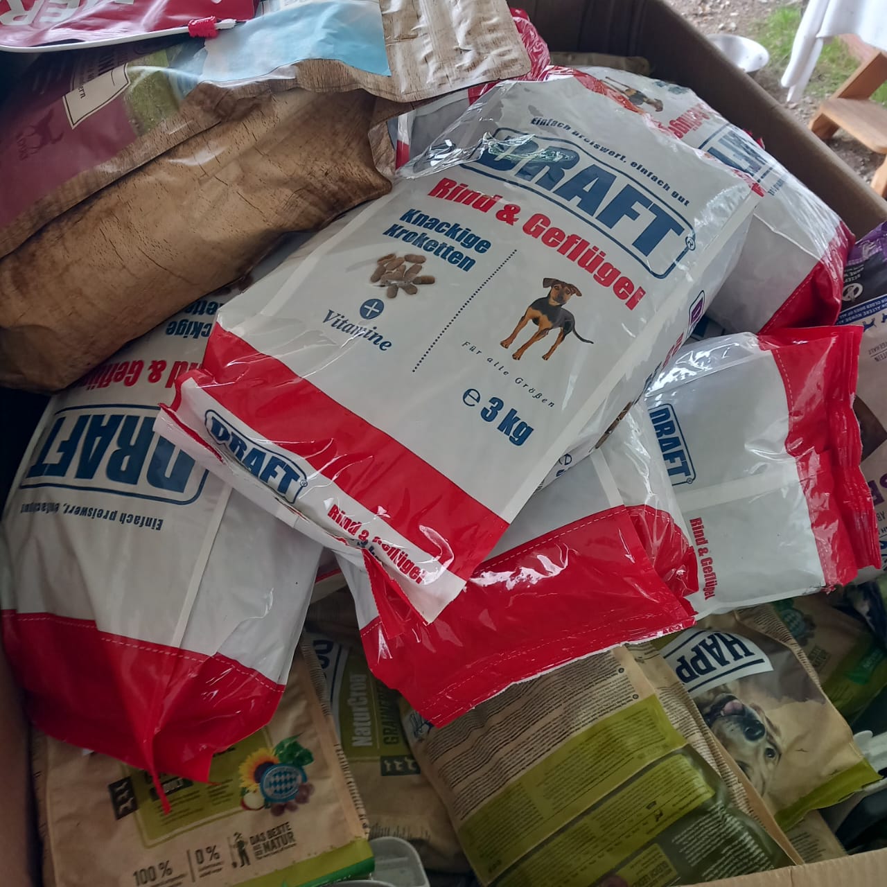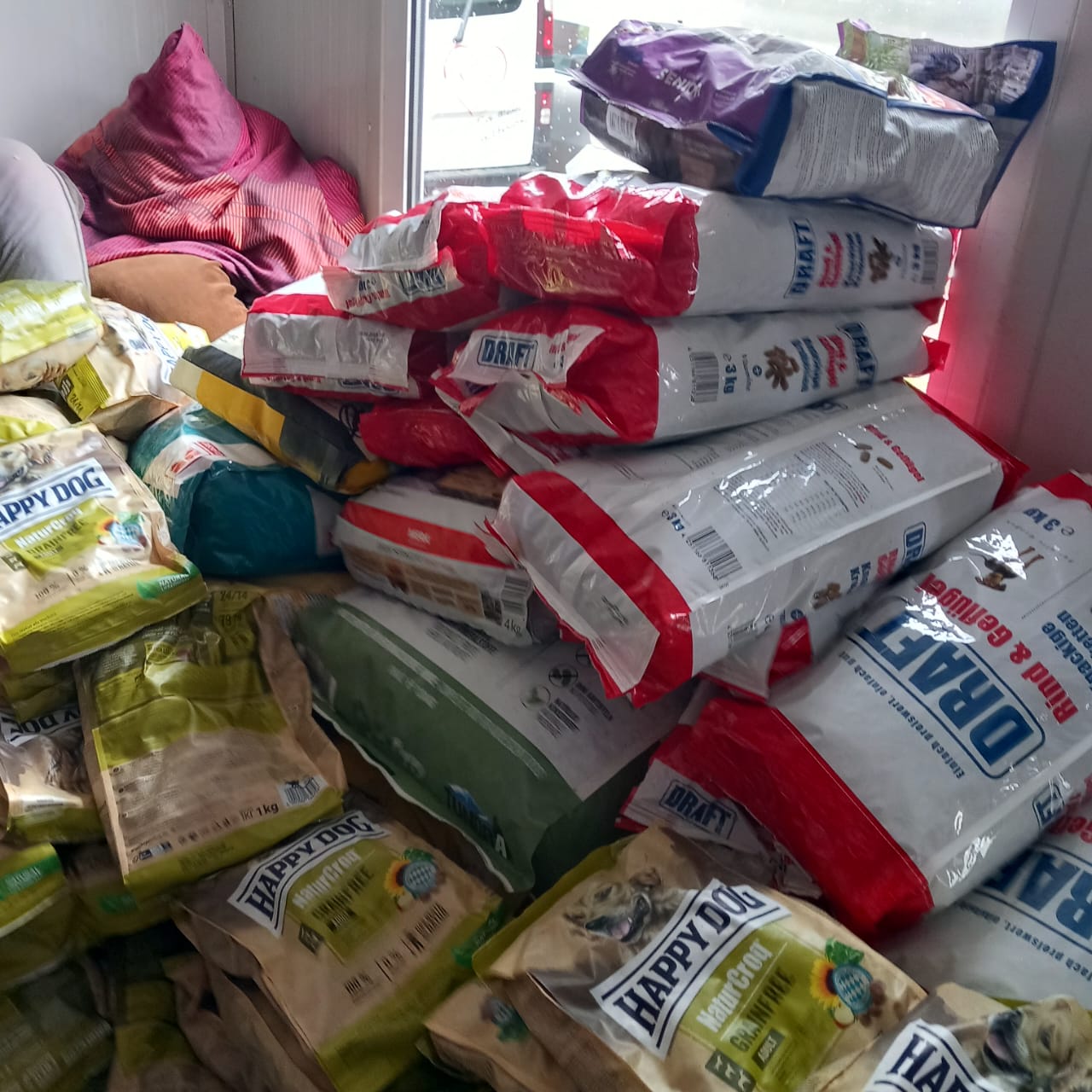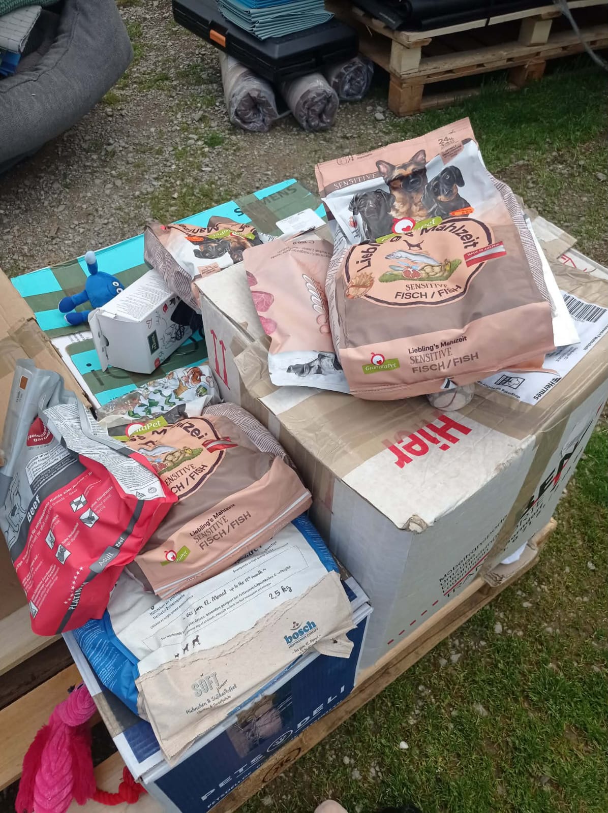 Zwei Paletten voller Futter, Hundebetten, Decken, Handtüchern und anderen nützlichen Dingen sind angekommen.