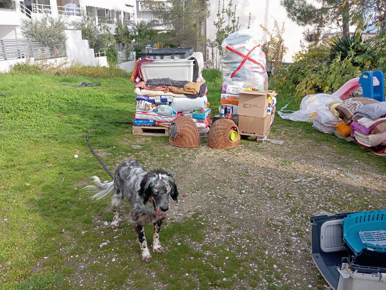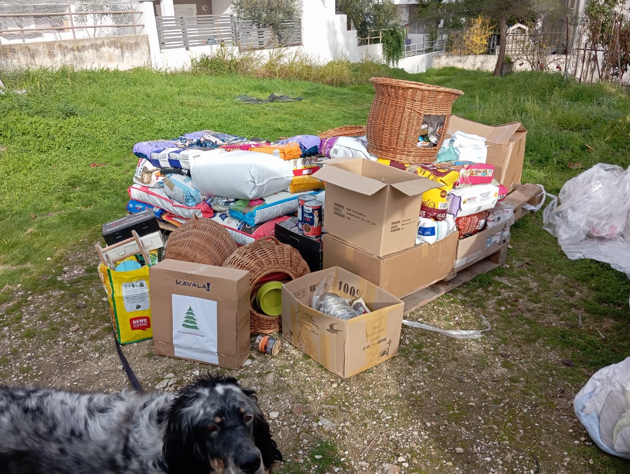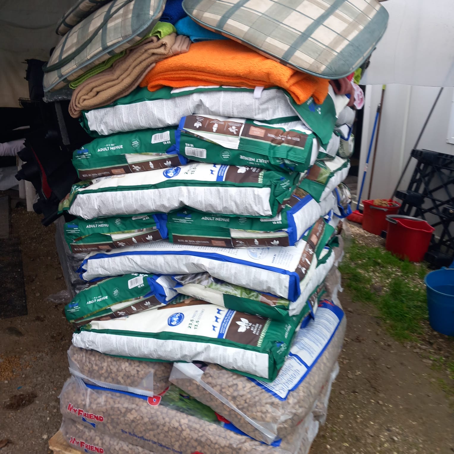 Zwei Paletten voller Futter, Hundebetten, Decken, Handtüchern und anderen nützlichen Dingen sind angekommen.