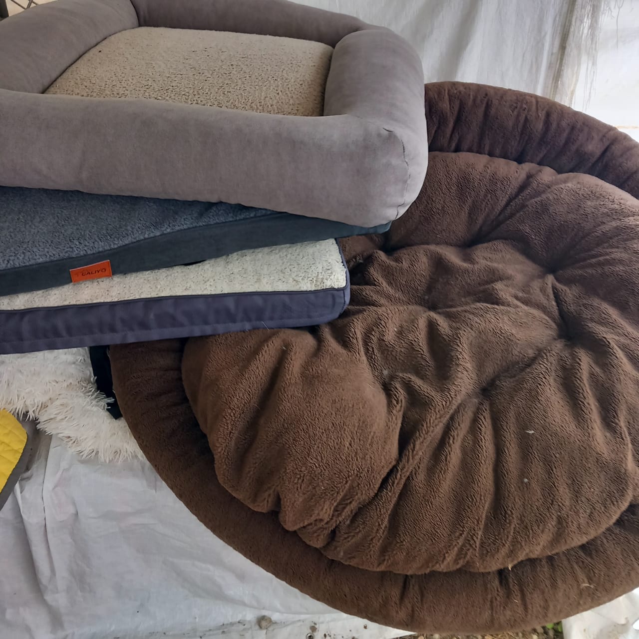 2 Paletten mit so vielen Gummimatten, Hundebetten und Bettdecken.