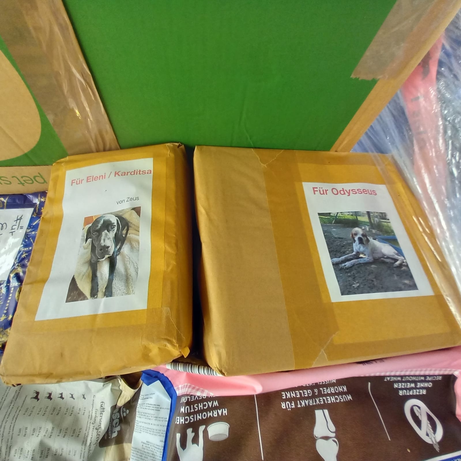 es kam eine Palette gefüllt mit Futter, Spielzeug, Hundepools and vielen anderen großartigen Dingen an.