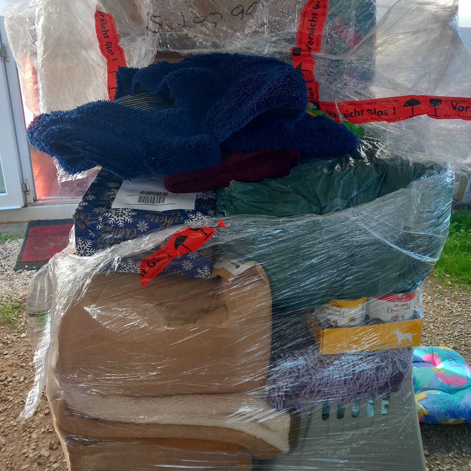 Drei Paletten voller Teppiche, Futter, Bettwäsche, Decken, Hundebetten, Spielzeug und Weihnachtsgeschenken sind angekommen. Meine lieben Freunde, ein weiteres Jahr neigt sich dem Ende zu, und es stimmt, dass wir dieses Jahr wieder gemeinsam durchgestanden haben!