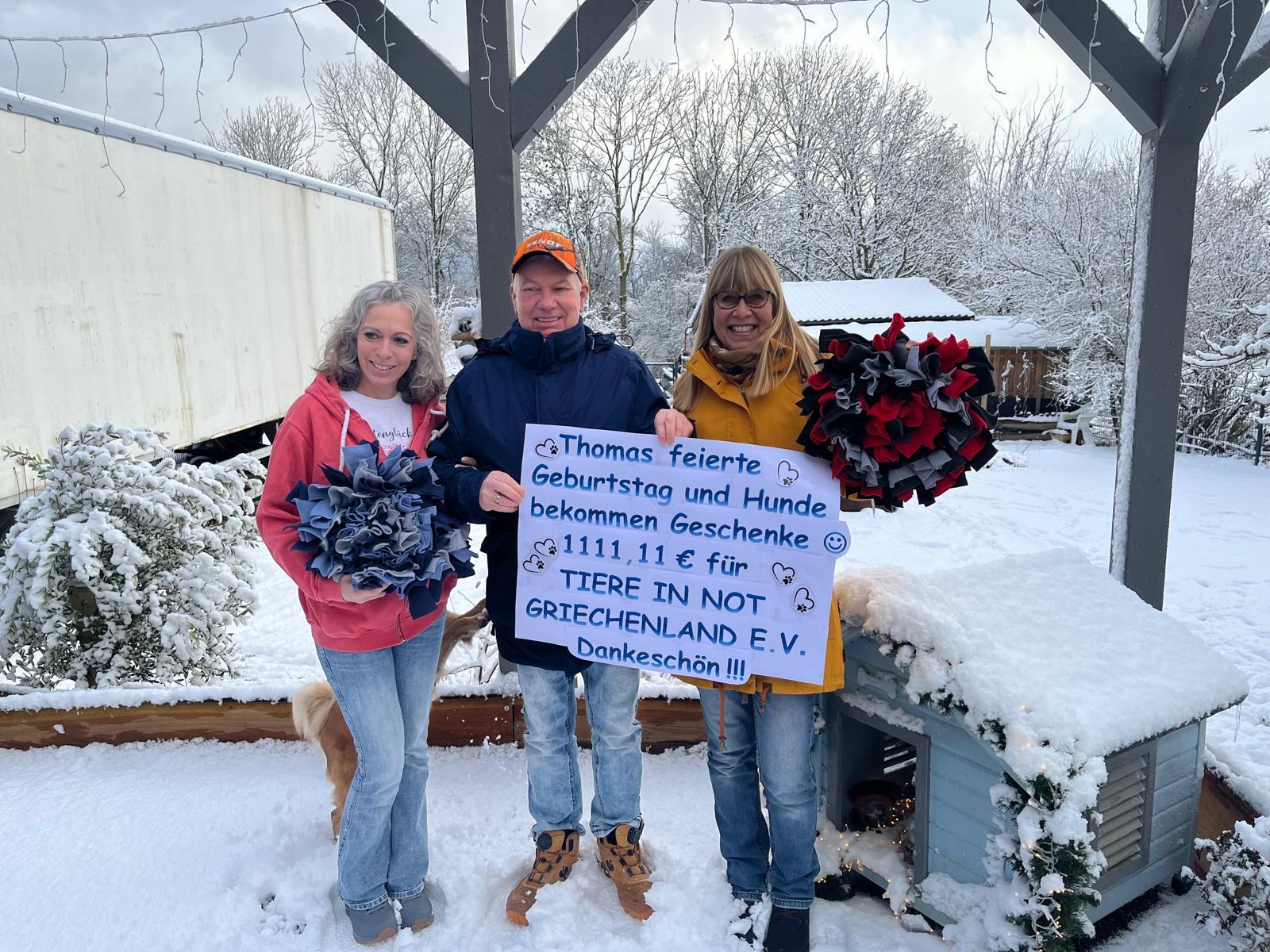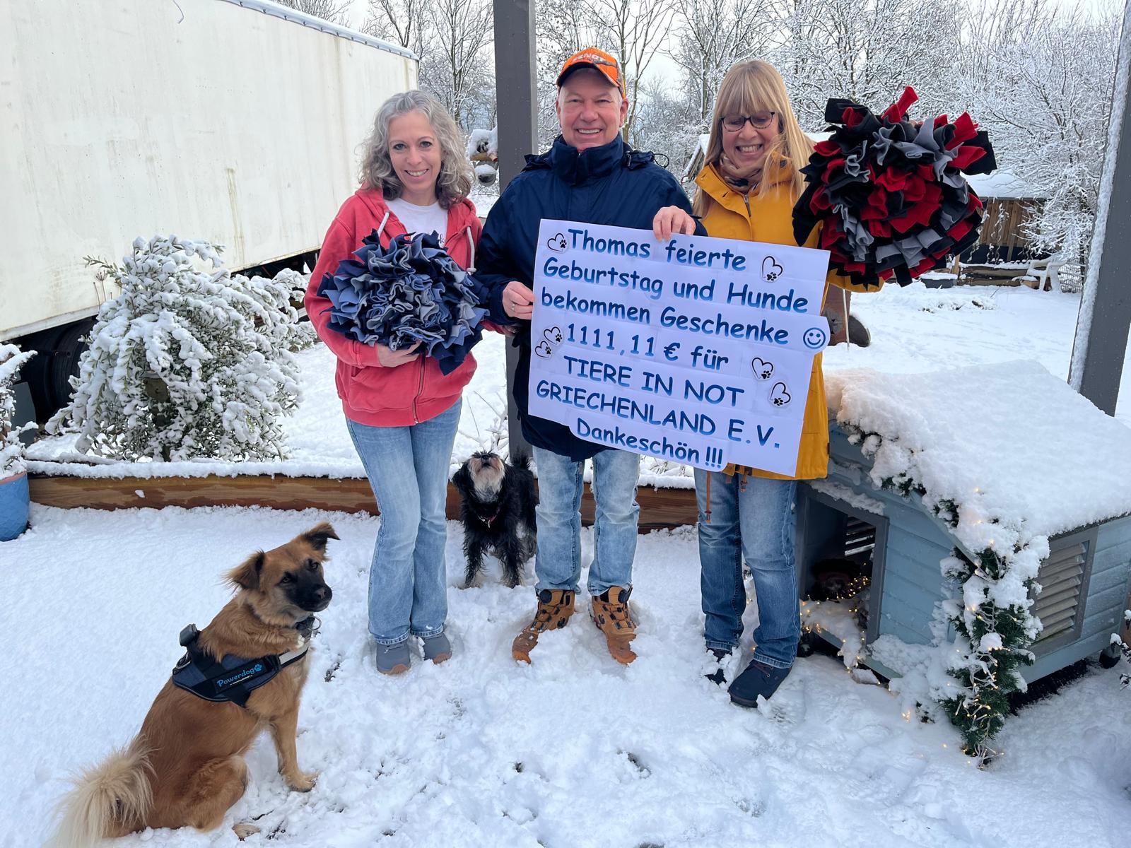 Gemeinsam mit Familie und Freunden kamen dabei 1.111,11 Euro zusammen, die vollständig unserem Verein zugutekommen. Ein Betrag, der konkret hilft: bei Futter, medizinischer Versorgung, sowie der Unterbringung unserer Hunde in deutschen Pensionen um neuen Platz in den Sheltern zu schaffen. Solche Gesten zeigen, was möglich ist, wenn Mitgefühl und Engagement zusammenkommen. Im Namen unserer Hunde - und des gesamten Teams - sagen wir von Herzen: Danke Thomas plus Anhang!!!