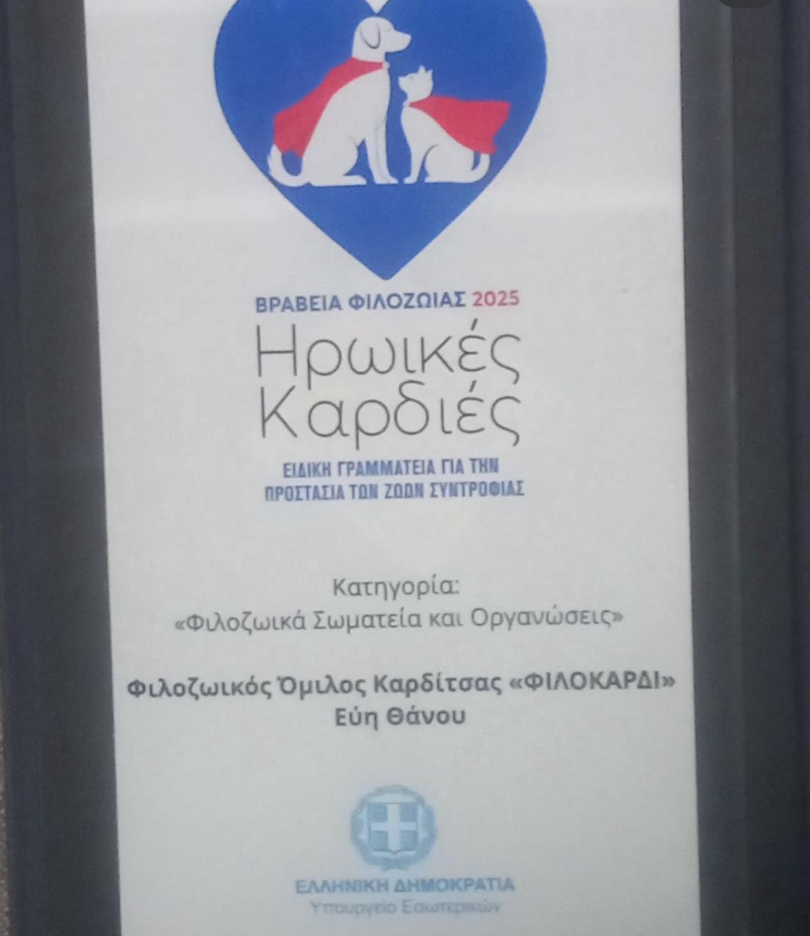 Unsere griechische Tierschützerin Evi Thanou wurde am 05.12.2025 mit dem Tierschutzpreis "Heroische Herzen 2025" ausgezeichnet. Der Preis wurde im Rahmen einer offiziellen Veranstaltung der "Sonderstelle für den Schutz von Heimtieren der Hellenischen Republik" verliehen. Ausgezeichnet wurde ihr Tierschutzverein "Karditsa Shelter Dogs", den Evi mit außergewöhnlichem persönlichen Engagement führt und der von uns seit nunmehr 17 Jahre begleitet und unterstützt wird.