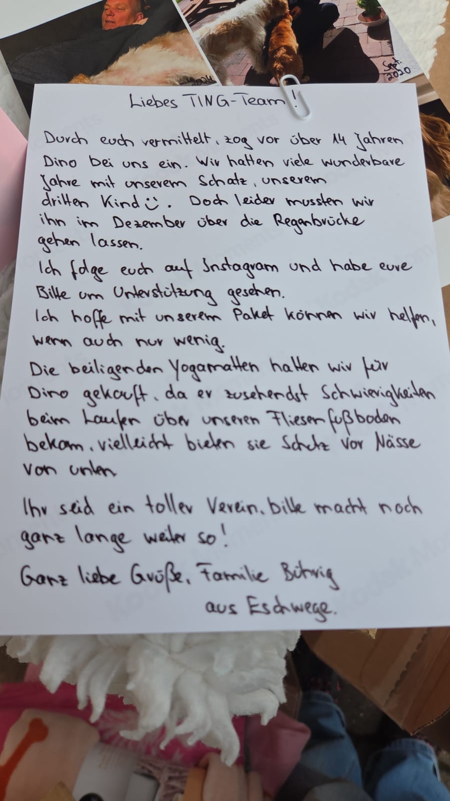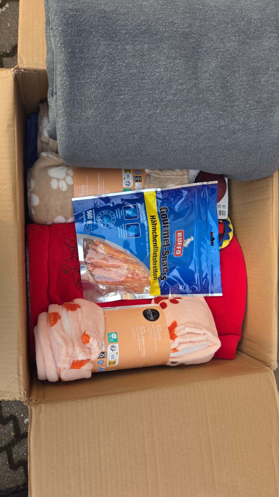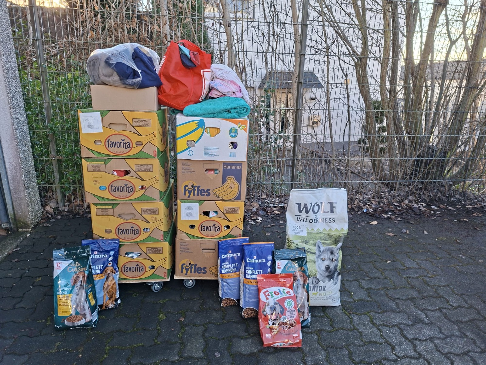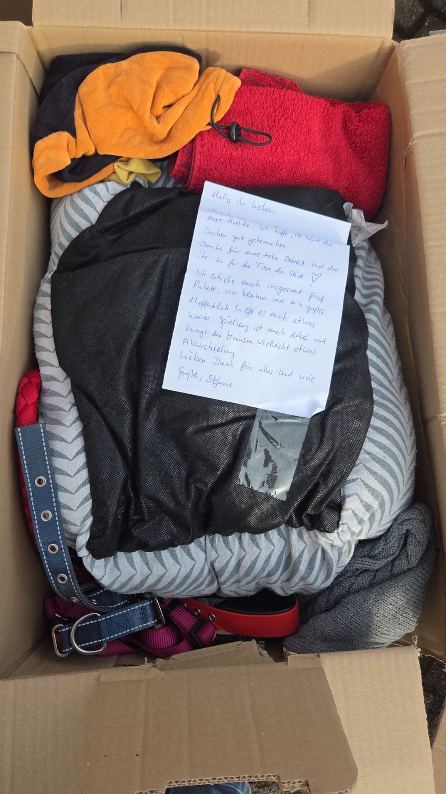 Auch heute durften wir wieder zahlreiche nützliche und liebevoll zusammengestellte Sachspenden in unserem Lager entgegennehmen. Darüber haben wir uns sehr gefreut. Ein herzliches Dankeschön geht an die Familie D. Wolf, Familie Wegner, das Hotel Sittardsberg in Duisburg, Familie Bethge und Familie Filges - mit lieben Grüßen von Lexi, Lenny/Wollie und Kaya/Pipitsa. Ebenso bedanken wir uns bei Kathrin Reimann, die erneut viele Spenden im Raum Ratingen für uns gesammelt und vorbeigebracht hat: