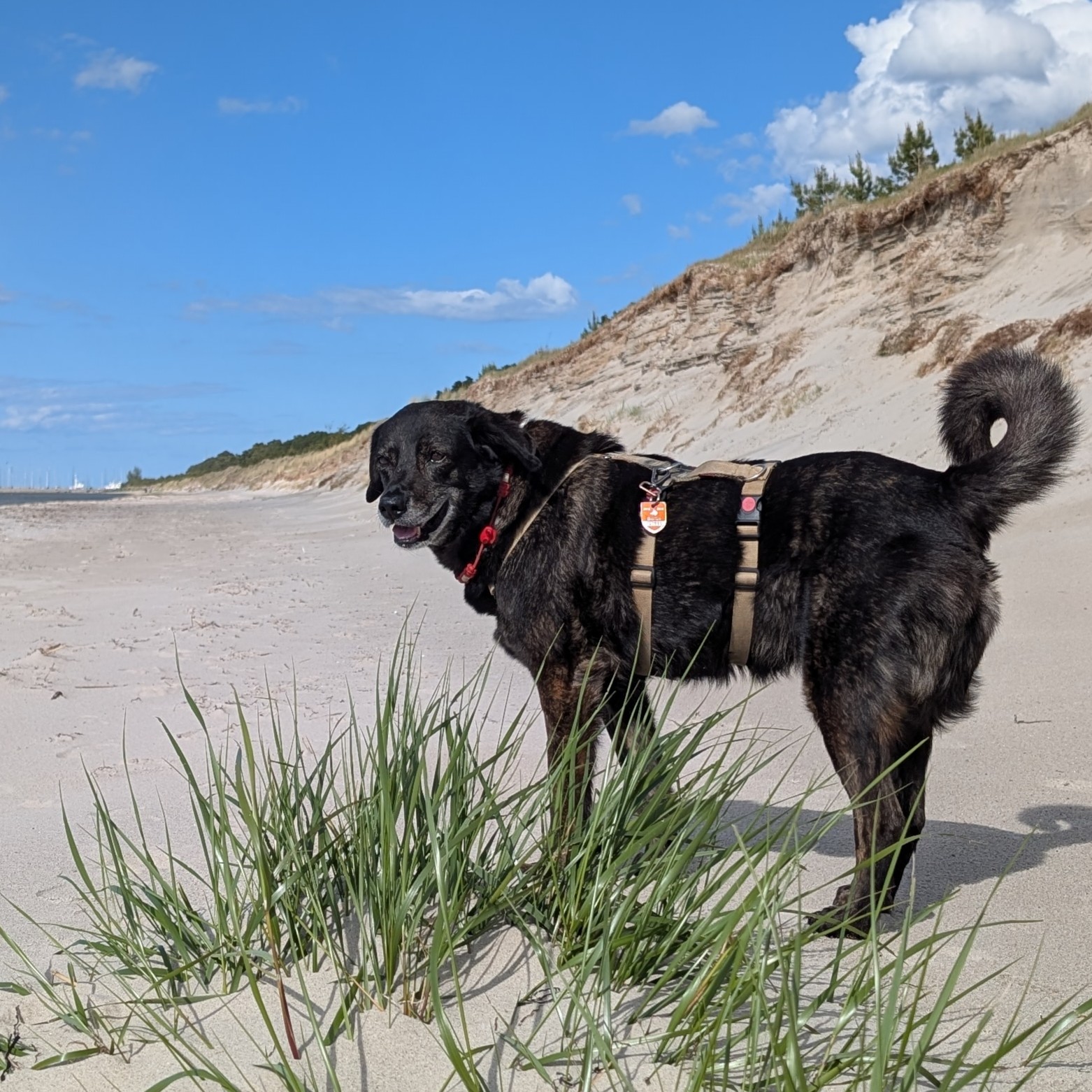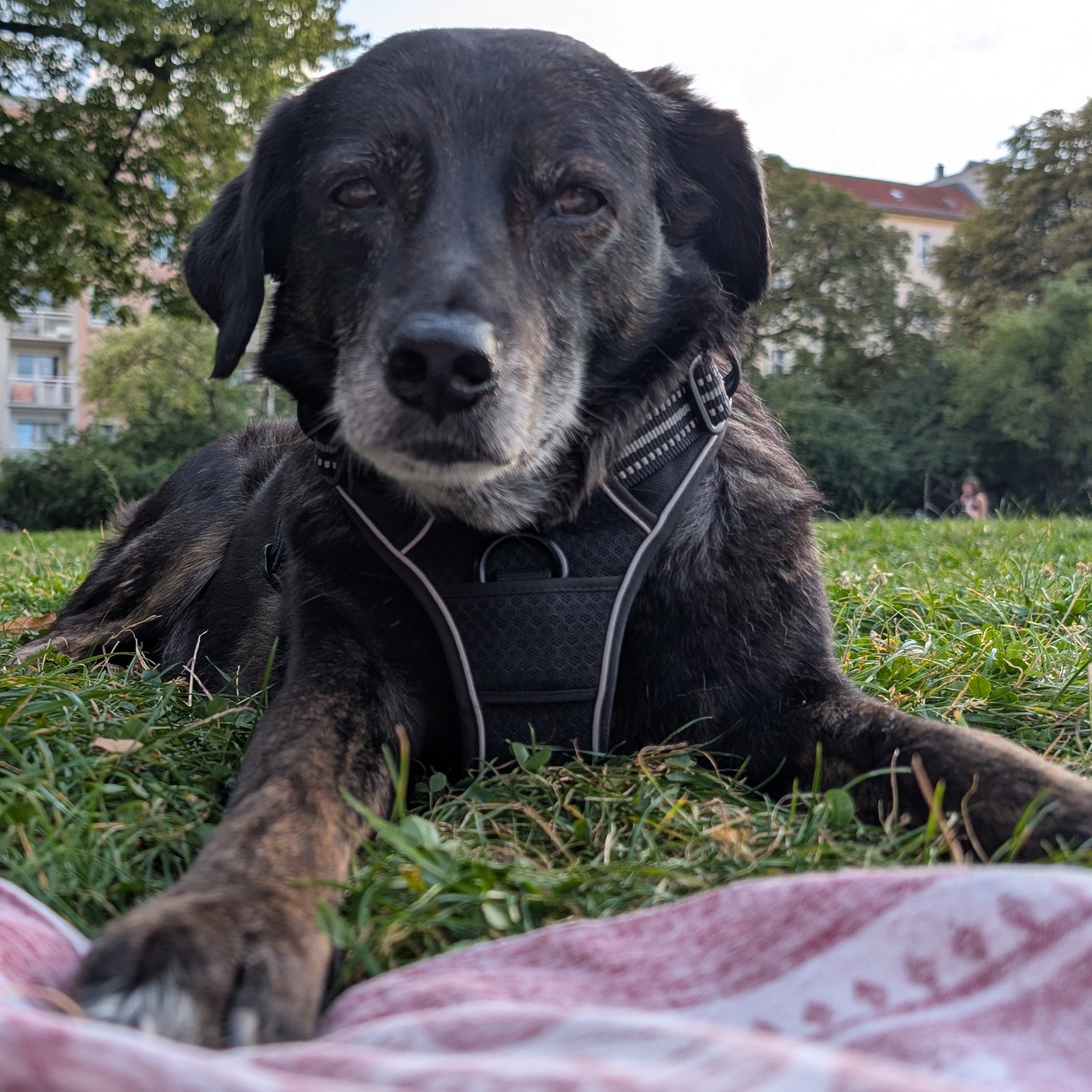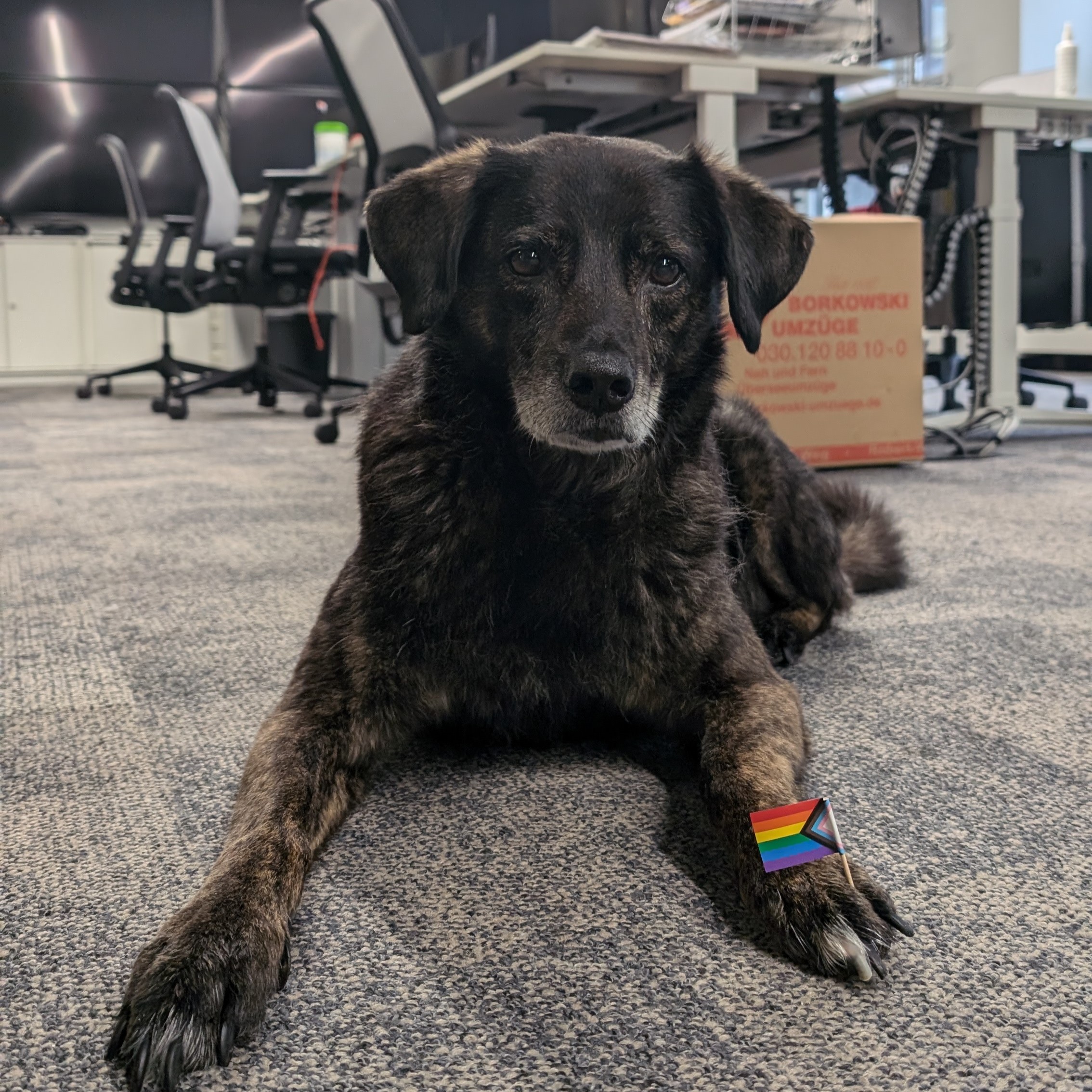 "Hier ist Dora. Ich habe mich super in meinem neuen Zuhause eingelebt. Es gibt drei mal am Tag was leckeres zu Essen! Und große Kausnacks, mit denen ich manchmal stundenlang beschäftigt bin. Und ganz tolle Spaziergänge, auf denen ich ganz viele Hunde treffe, schnüffeln darf und ganz viel markieren. Nach so vielen Abenteuern schlafe ich am liebsten auf der Couch oder lass mir den Bauch kraulen. Ganz entspannt. Frauchen und Herrchen finden es besonders lustig, dass ich so viele Geräusche mache. Vor allem früh muss ich manchmal ganz laut gähnen, das klingt wie ein Geist und weckt die beiden auf. Hihihi. Außerdem kann ich jetzt langsam schon richtig gut mit der Bahn fahren. Nur ins Auto einsteigen habe ich noch nicht kapiert, ohh. Naja. Bald geht`s glaube ich auch mal ins Büro. Liebe Grüße, Dora"