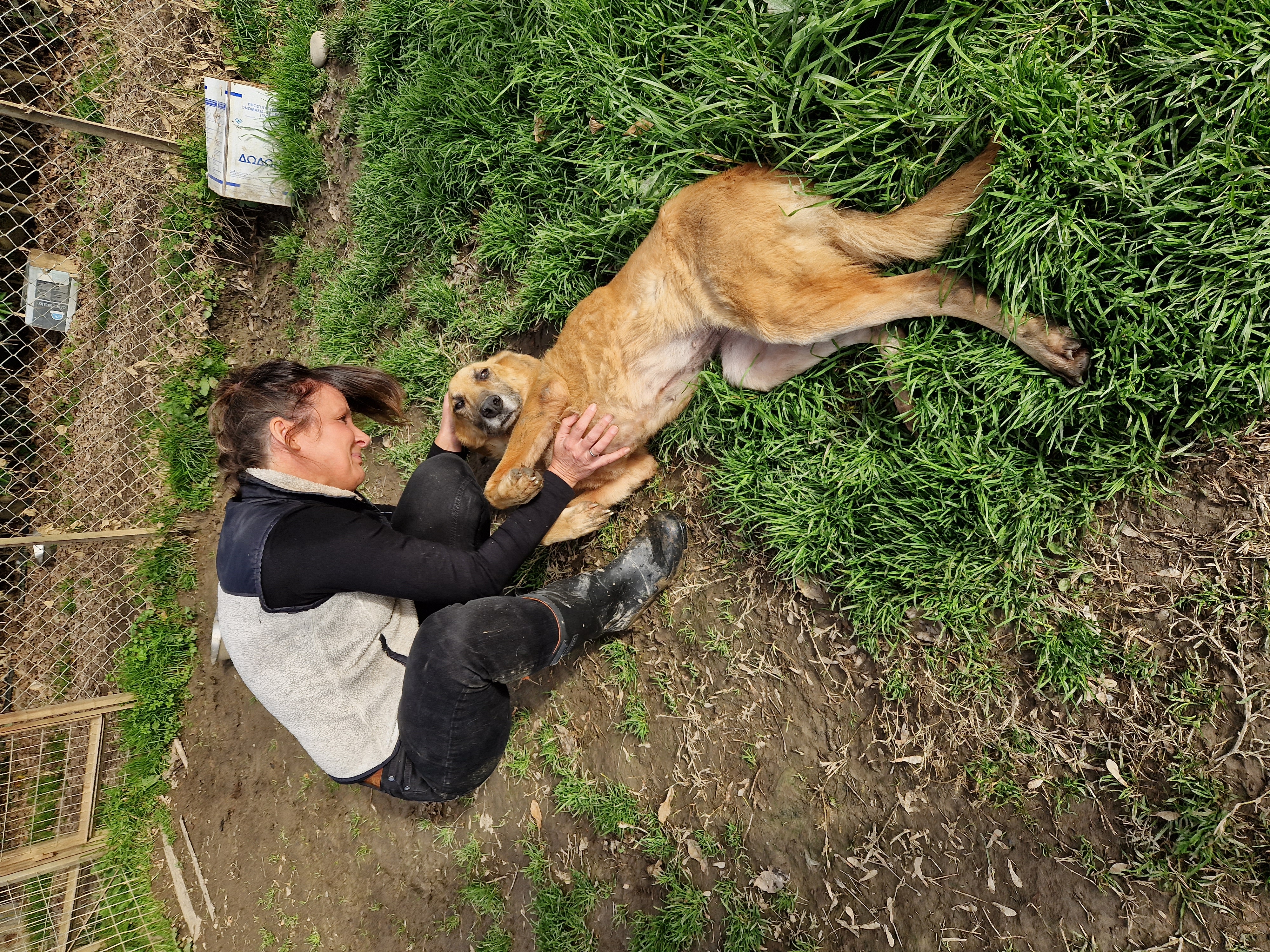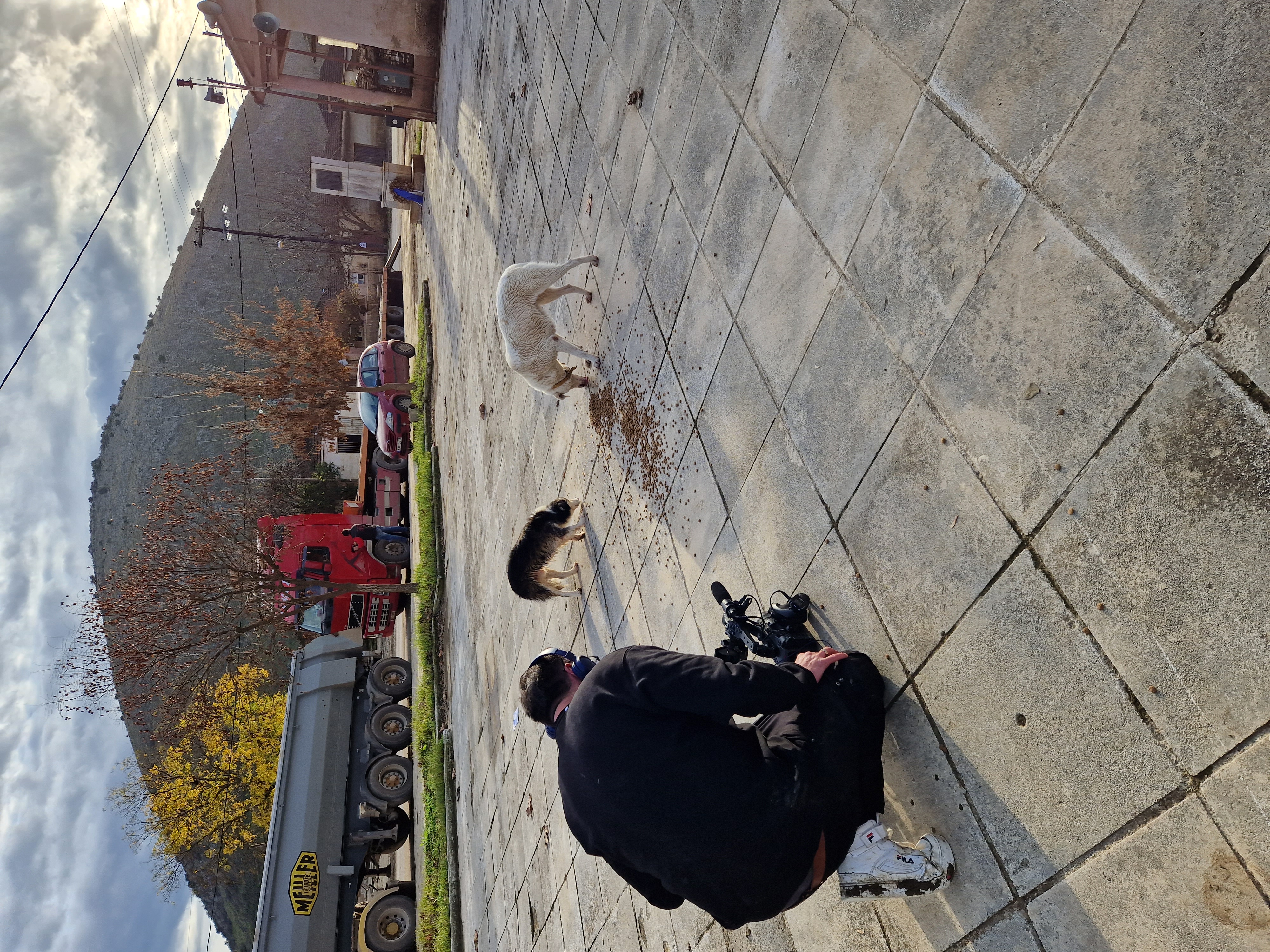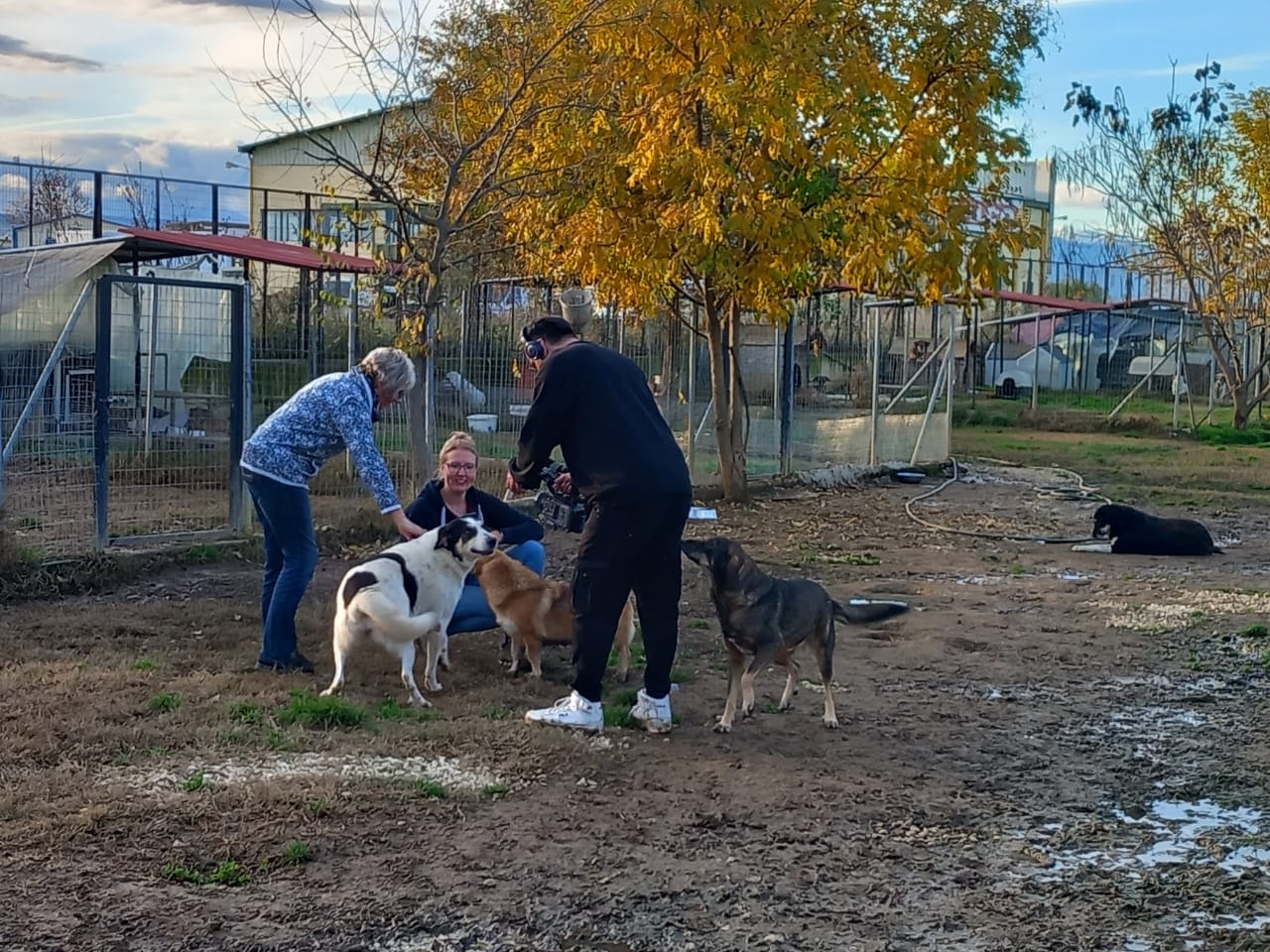 Wir waren noch nicht ganz aus dem Rathaus raus, da klingelte Evi's Telefon: Ein Fußgänger meldete ausgesetzte Welpen im Bewässerungskanalsystem. Es stand außer Frage: da fahren wir hin, suchen die Welpen und bringen sie in Sicherheit. Als wir angekommen waren, liefen wir ein paar Meter und schon hörte man die 3 Racker verzweifelt quieken: allein zurückgelassen auf dem nass-kalten Betonboden des Kanalnetztes, welches (für diesen Tag Gottseidank) nur in den Sommermonaten für die Bewässerung der Felder genutzt wird. Wir nahmen sie sofort hoch, gaben ihnen eine große Portion Futter und ein warmes Plätzchen. Uns ist der Ort nicht unbekannt: im gesamten Kanalsystem werden regelmäßig Welpen und auch erwachsene Hunde ausgesetzt, wenn sie von den Besitzern nicht mehr erwünscht sind. Wären wir nicht gerufen worden, hätten die 3 dort keine Überlebenschancen gehabt :( Es stockt einem natürlich der Atem, mit welcher Herzlosigkeit die Hunde "entsorgt" werden -> Video "Welpenrettung". Mit den Welpen im Gepäck ging es dann Richtung neues Tierheim. Als wir ankamen, war Vaitsa bereits fleißig bei der Fütterungsrunde am Nachmittag. Nachdem Goran das Tierheim per Drohne erkundet hat und Thanasis die 3 Welpen abgeholt hat, ging es ins Tierheim. Wir zeigten einige "Baustellen", redeten über die Hunde, deren Geschichte, über Evi's Arbeit und vieles mehr. Simone und Goran waren sehr ergriffen, als Evi davon berichtete, wie sie im September die Hunde aus dem Wasser gerettet hat. Auch für uns ist das immer noch eine sehr emotionale Geschichte, weil uns sowohl das Leben der Hunde am Herzen liegt, aber besonders auch Evi's Einsatz in der Nacht nicht ungefährlich war: Wir schauten die Tage über fast minütlich auf unsere Handys und warteten auf ein Lebenszeichen von unseren Freunden. Evi hatte kürzlich eine weibliche Hündin aufgenommen, die von einem Mann abgegeben wurde. Sie bekam kurz danach 4 Welpen, die sie nun liebevoll aufzieht (natürlich kommen die Mama und auch die Welpen, sobald sie geimpft und alt genug sind, in die Vermittlung). Ob die Abgabe mit der Trächtigkeit zusammenhängt, kann man nur erahnen, aber auch das gehört zum Alltag in Griechenland dazu. Auch unser Besuch bei unserem kleinen Skinny hat Simones und Gorans Herz schwer gemacht und es flossen viele Tränen. Wir sind sehr traurig, das sein kleiner Körper nicht mehr die Kraft hatte, den Kampf um sein Leben gewinnen zu können. Wir werden Skinny nie vergessen ......🖤 Als es anfing zu dämmern, beendeten wir die Arbeit für den Tag und ließen den Abend in einem Restaurant außerhalb von Karditsa - mit Blick über das gesamte Tal - ausklingen -> Video "neues Tierheim". Natürlich fehlten auch hier keine Geschichten aus dem Tierschutzalltag und es wurden bereits Pläne für den nächsten Tag geschmiedet.