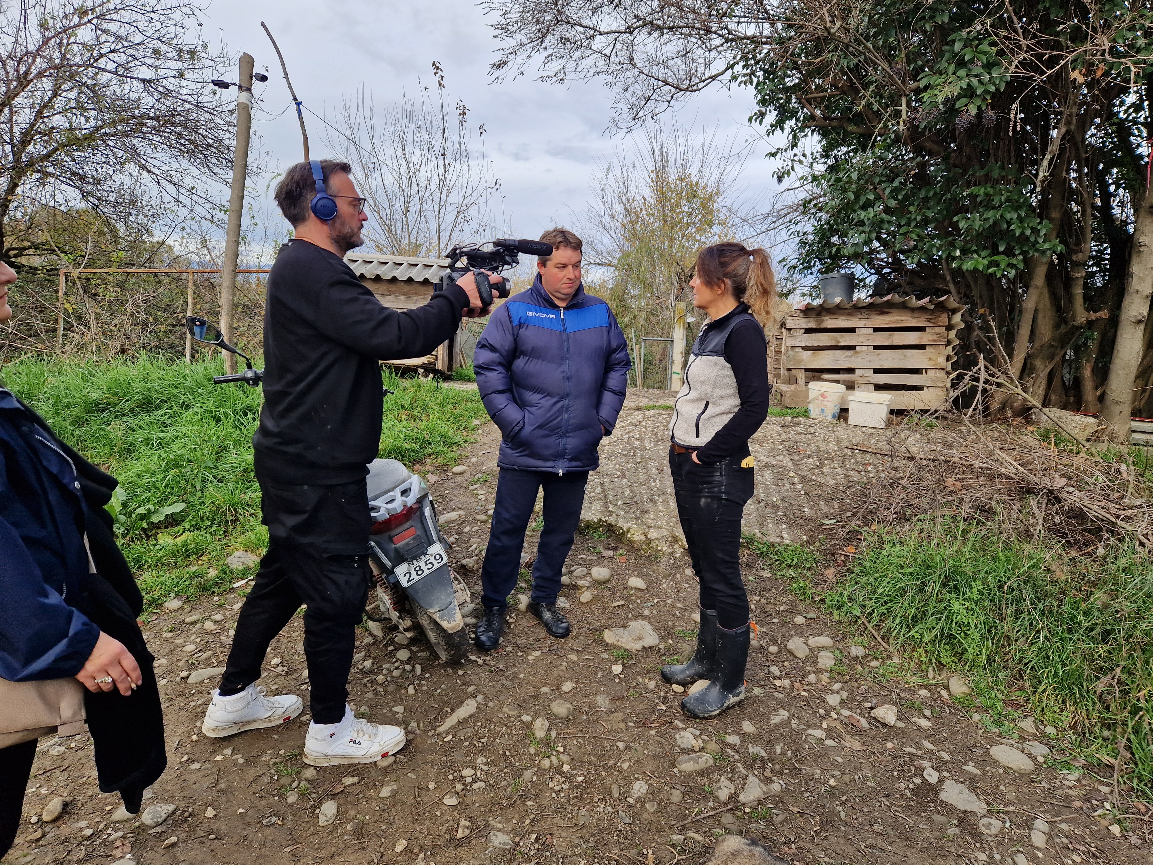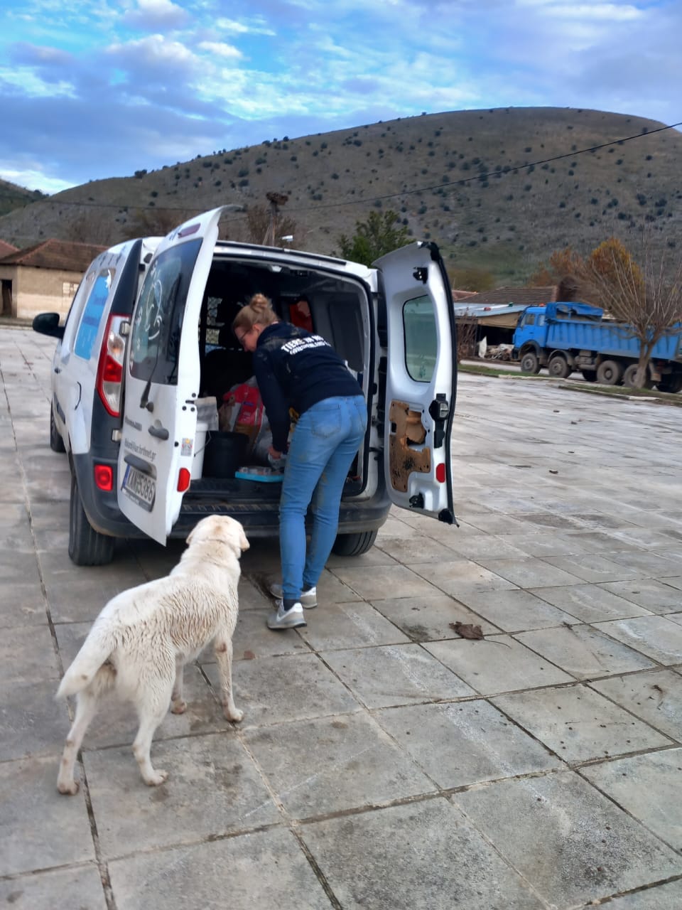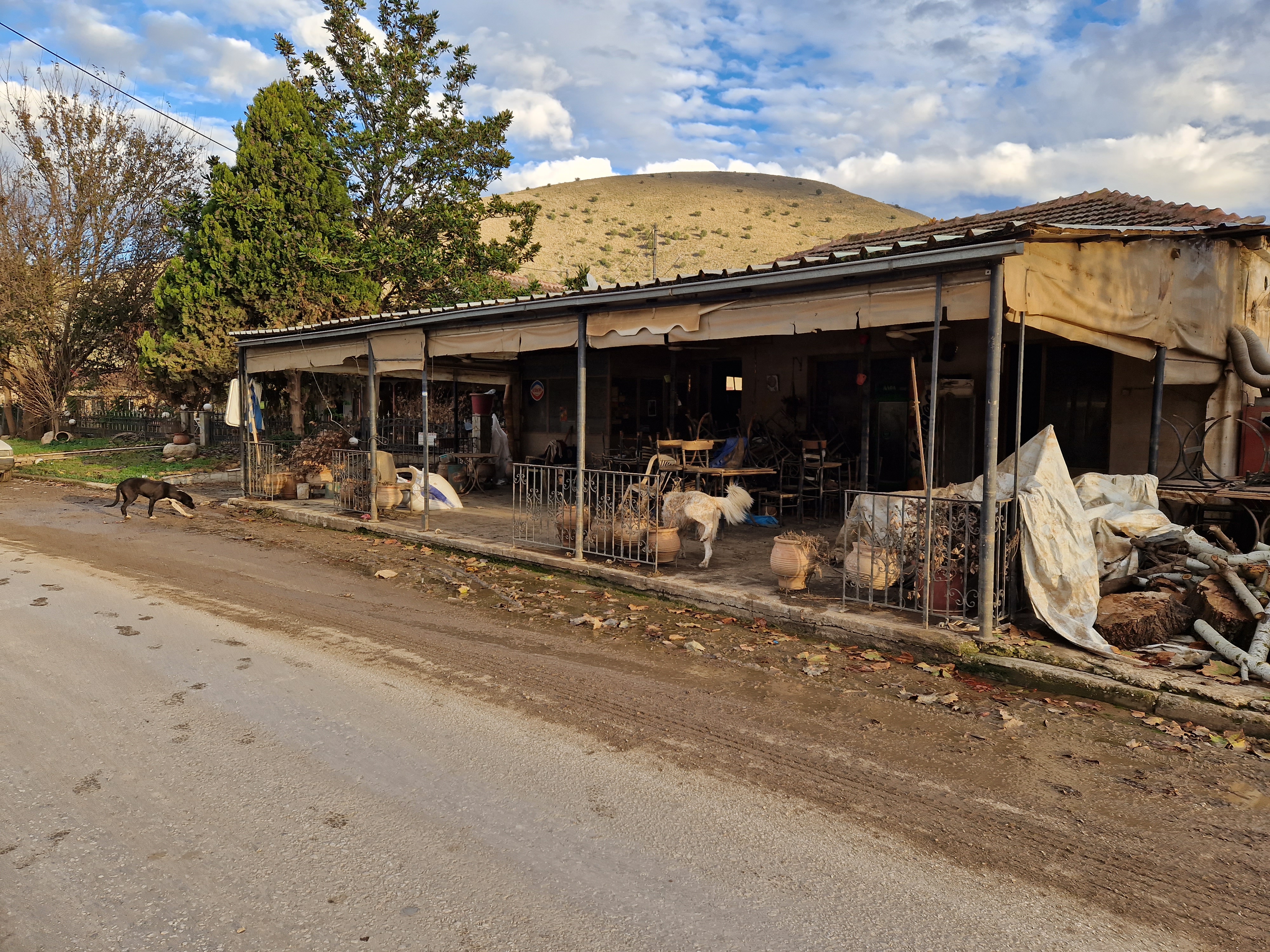 Nachdem wir unsere Akkus bei einer kurzen Kaffeepause aufgeladen haben, fuhren wir zusammen nach Vlochos - ein Dorf in der Nähe von Karditsa, welches im September besonders schlimm von der Überschwemmung getroffen wurde. Evi war bereits zu mehreren Rettungseinsätzen in dem Dorf und konnte mehrere Hunde, Katzen, Papageien und Meerschweinchen per Boot sichern. Auch hier herrscht eine traurige Atmosphäre, man kommt sich vor wie in einer Geisterstadt. Die Häuser sind leer, überall sind noch große Pfützen, sogar Teiche. Es stehen kaputte Möbel, Autos und Geräte herum. Man erkennt, wo früher mal eine Taverne oder ein Geschäft war und kann sich bildlich vorstellen, wie wohl die Dorfgemeinde hier bis September ihr Leben gestaltet hat. Am Kirchplatz treffen wir den Dorfbürgermeister - er war gerade dabei einen Tannenbaum aus Lichterketten aufzubauen: in den nächsten Tage sollte eine kleine Weihnachtsfeier für die ehemalige Bewohner statt finden. Weitere Menschen konnte man kaum vorfinden, jedoch jede Menge herrenlose Hunde und Katzen. Wahrscheinlich gehörten sie bis September den Einwohnern und sind nun selbst für sich verantwortlich. Wir verteilten rund um den Marktplatz Futterportionen. Anscheinend war die letzte Mahlzeit schon etwas länger her, da direkt Stress unter den Hunden ausgebrochen ist. Evi's "Futtermobil" war heiß beliebt und so holten sich viele noch eine Extraportion ab. Wir sorgten dafür, dass am Ende alle Zugang zum Futter bekamen, war uns in dem Moment bewusst, dass sie bis zur nächsten Mahlzeit wieder Tage warten müssen. Leider kann Evi und ihr Team die Dörfer nicht in die täglich Straßenhundetour integrieren, da die Fahrtstrecke einfach zu weit ist. Aber immer, wenn jemand in der Nähe ist, wird ein Abstecher gemacht. Die Häuser müssen alle chemisch gereinigt werden und einige sind vom Einsturz gefährdet, sodass es nicht absehbar ist, ob und wann hier wieder Leben eintreten wird -> Video "Vlochos". Kurz bevor wir das Dorf verlassen haben, haben wir ein Ehepaar entdeckt, deren Hund wir im September von einem Balkon befreit haben. Die Freude war groß, sodass wir kurz anhielten und uns austauschten. Hiermit endete die gemeinsame Zeit mit Evi und auch dem Filmteam. Abends ging es noch nach Thessaloniki zurück, da am nächsten morgen früh der Flieger nach Hause abhob.